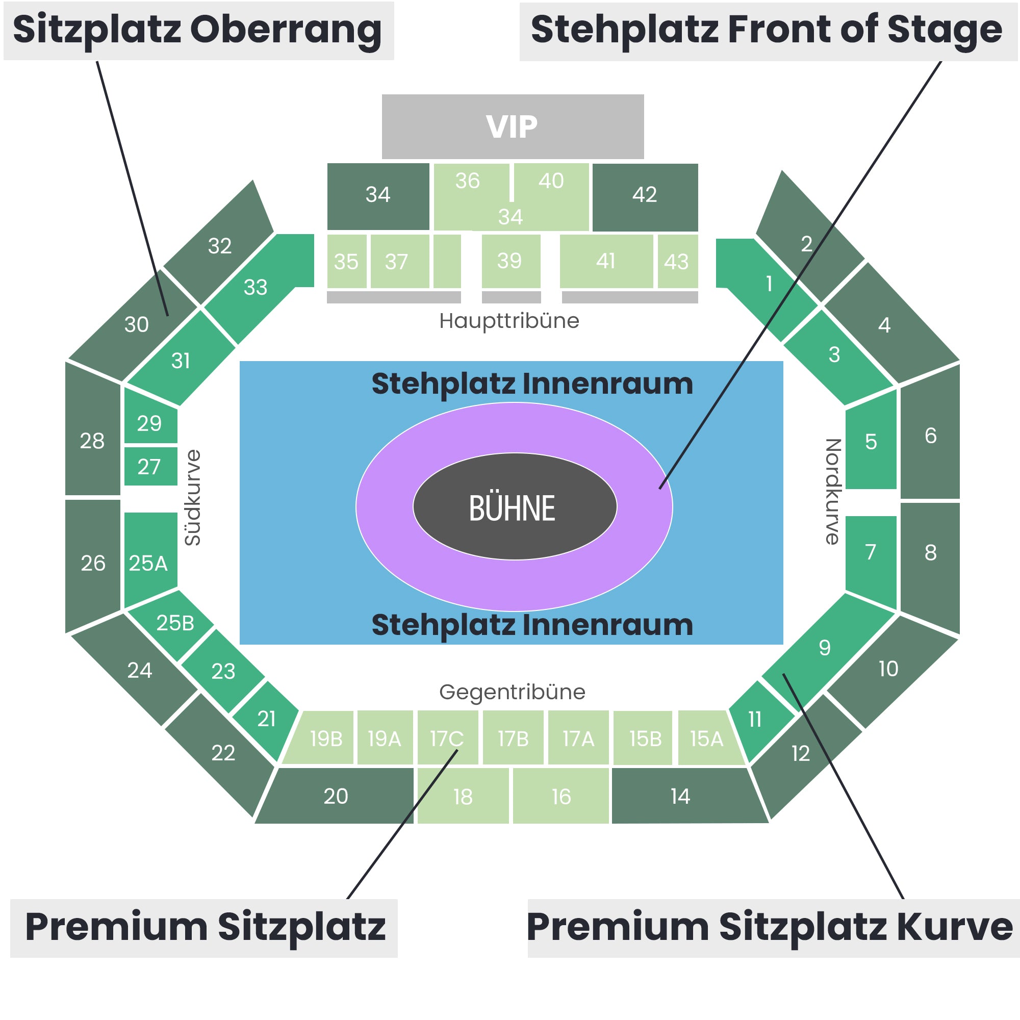 - Wo befinden sich die Plätze: Ihre Sitzplätze/Stehplätze gehören genau zu der Kategorie, die Sie gewählt haben und werden nach unserem Bestplatzverfahren vergeben. Ihre Sitzplätze befinden sich mindestens paarweise nebeneinander. Garantiert!