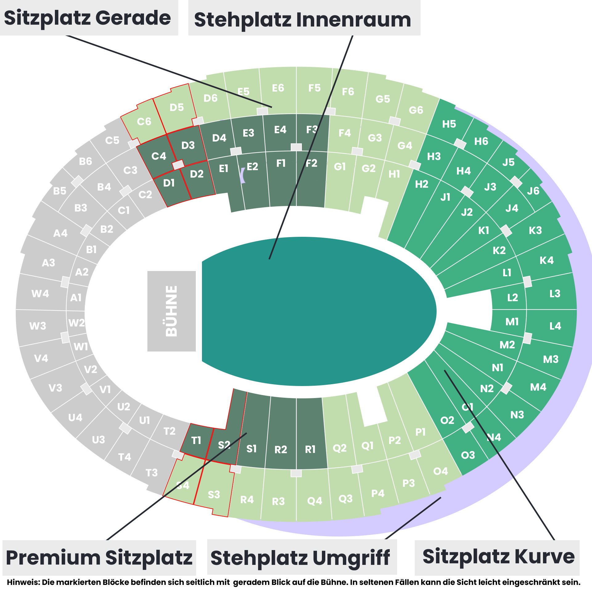 - Wo befinden sich die Plätze: Ihre Sitzplätze/Stehplätze gehören genau zu der Kategorie, die Sie gewählt haben und werden nach unserem Bestplatzverfahren vergeben. Ihre Sitzplätze befinden sich mindestens paarweise nebeneinander. Garantiert!